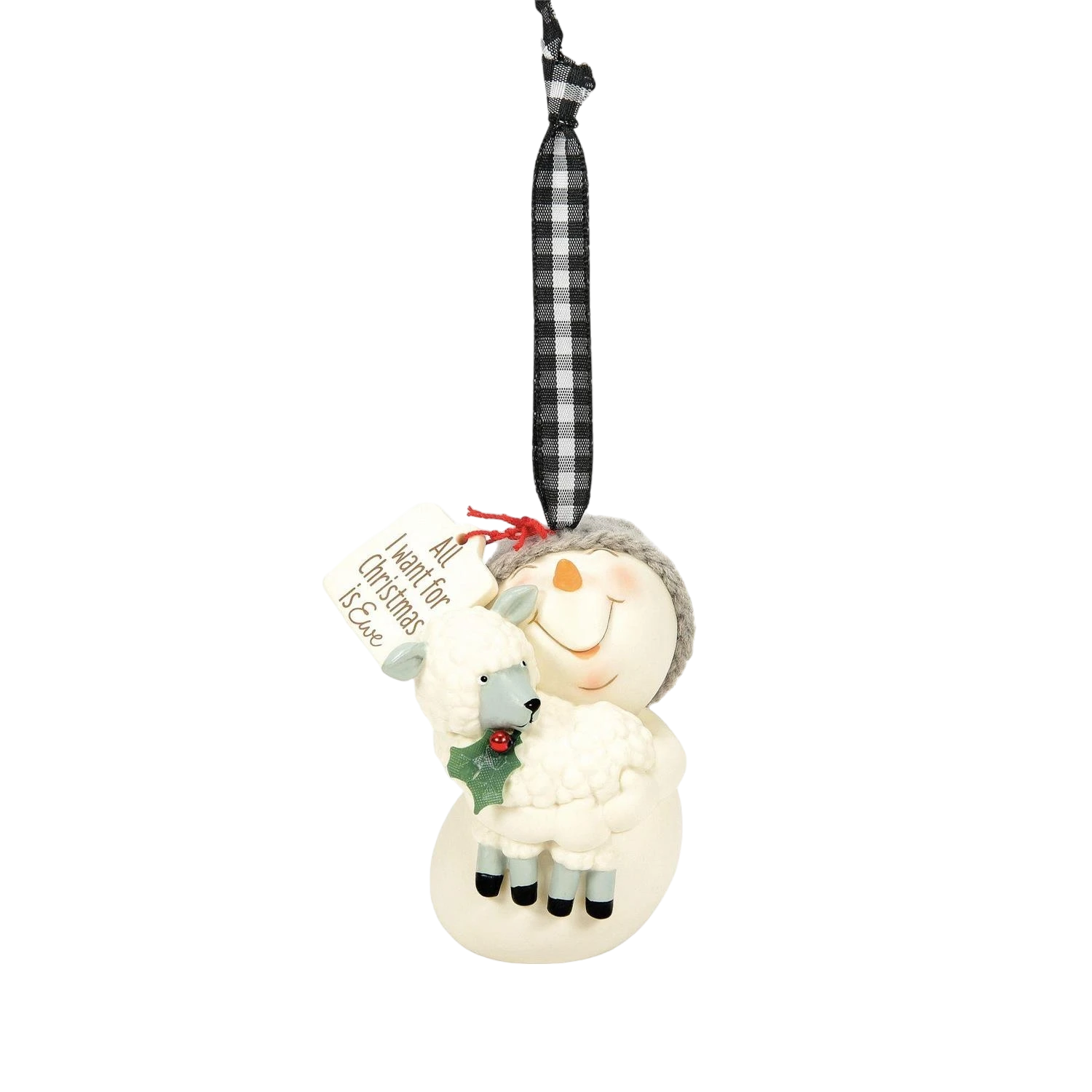 Adding to its charm, the snowman holds a small tag that reads, “All I Want for Christmas is Ewe,” a whimsical pun that adds a touch of humor to this heartwarming scene. The lamb, with its soft fur texture made from PVC, holds a sprig of holly, symbolizing holiday cheer and adding a pop of color to the piece. Holly has long been associated with Christmas, dating back to ancient times when it was believed to ward off evil spirits and bring good luck.