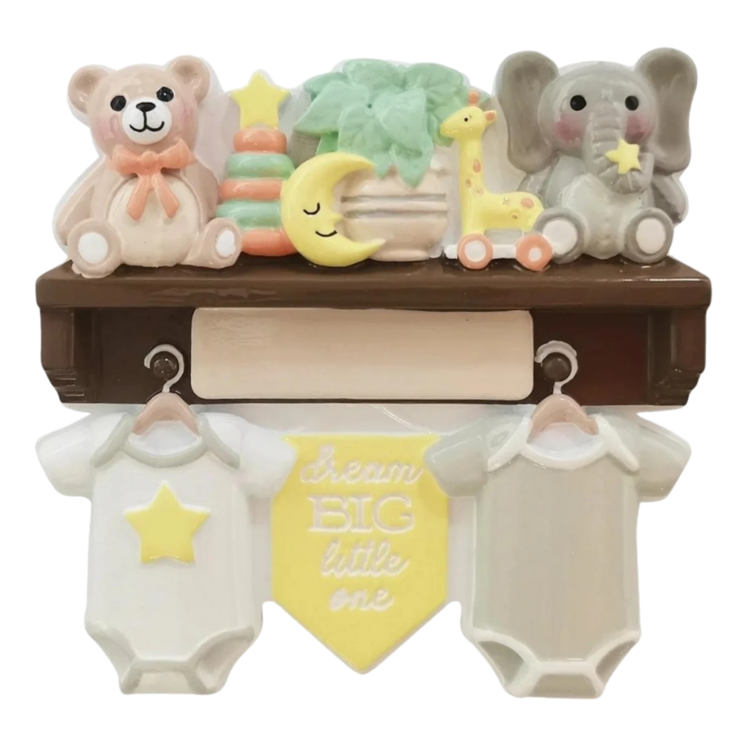Welcome the littlest member of your family to the holiday festivities with this adorable baby nursery ornament. Designed to capture the heartwarming essence of a baby’s room, this charming piece showcases sweet details such as a cuddly teddy bear, a friendly elephant, a stack of colorful blocks, and a soothing moon and star motif. Hanging below, two tiny onesies and a banner that reads “Dream Big Little One” bring a touch of whimsy and joy to this keepsake, making it a perfect decoration for celebrating a new arrival.