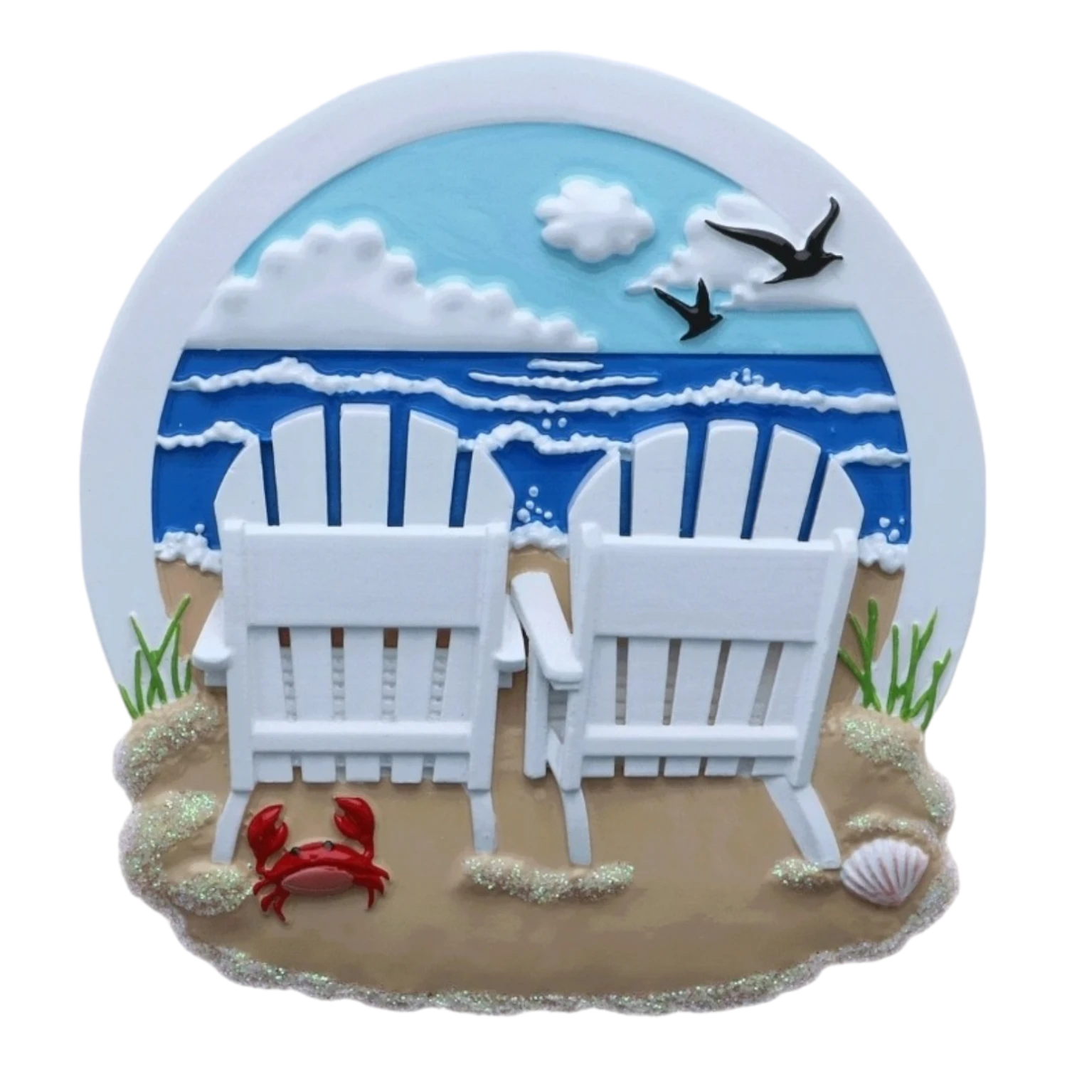 Embrace the tranquility and joy of seaside living with this enchanting beach scene ornament. Featuring two Adirondack chairs nestled on a sandy shore, this beautifully detailed ornament captures the serene beauty of a beach getaway. The vivid blue waves gently lap against the shore, while a cheerful red crab and scattered seashells add touches of coastal charm. Overhead, seagulls soar in a clear, sunny sky, evoking the peaceful sounds of the ocean and the promise of a restful escape.