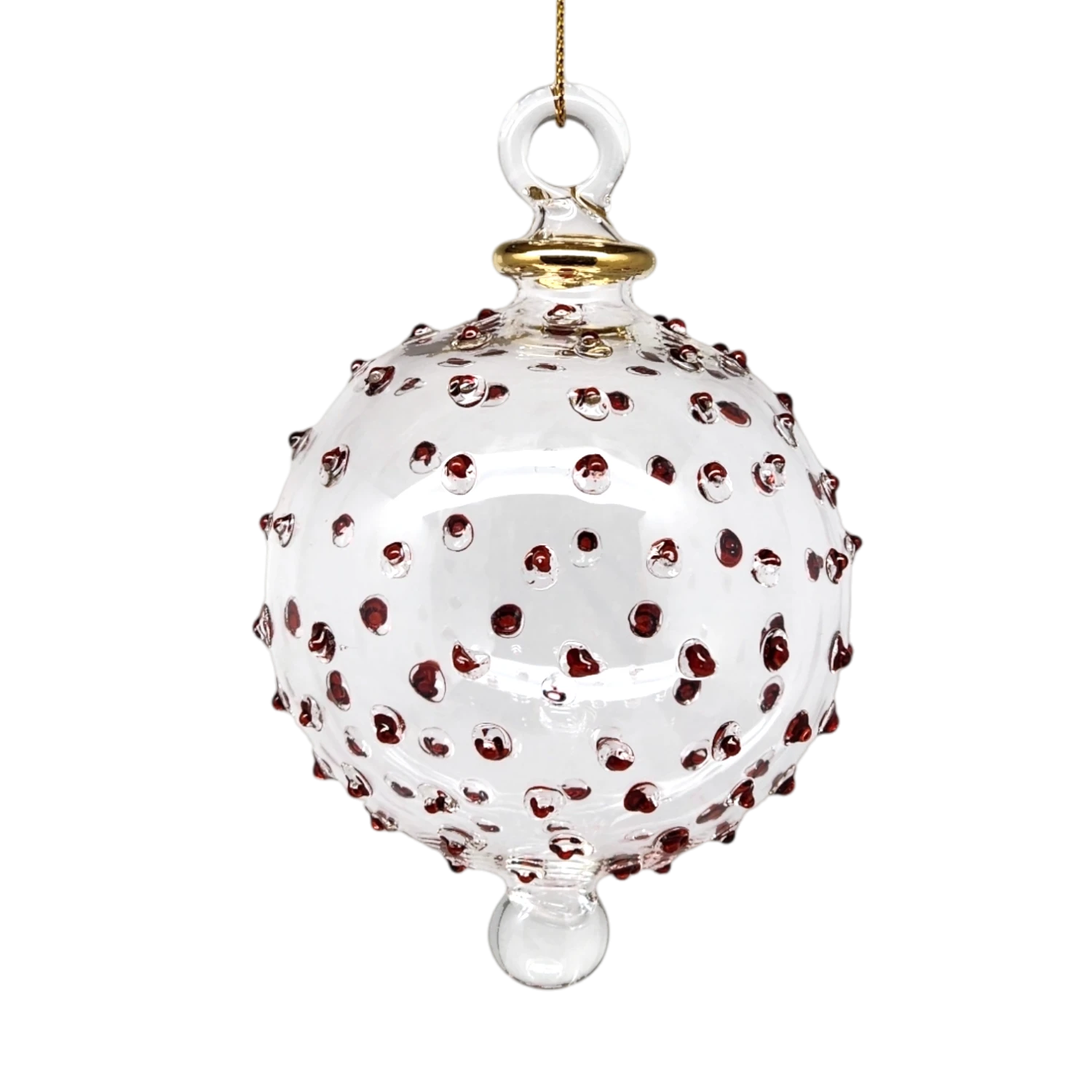 Adorn your holiday decor with this delightful Clear Glass Stipple Ball in Red. This charming ornament is handcrafted using traditional glassblowing techniques that emphasize both artistry and precision. Each almost 3-inch sphere is embellished with striking red stipple dots, creating a playful yet sophisticated design that sparkles with festive cheer.