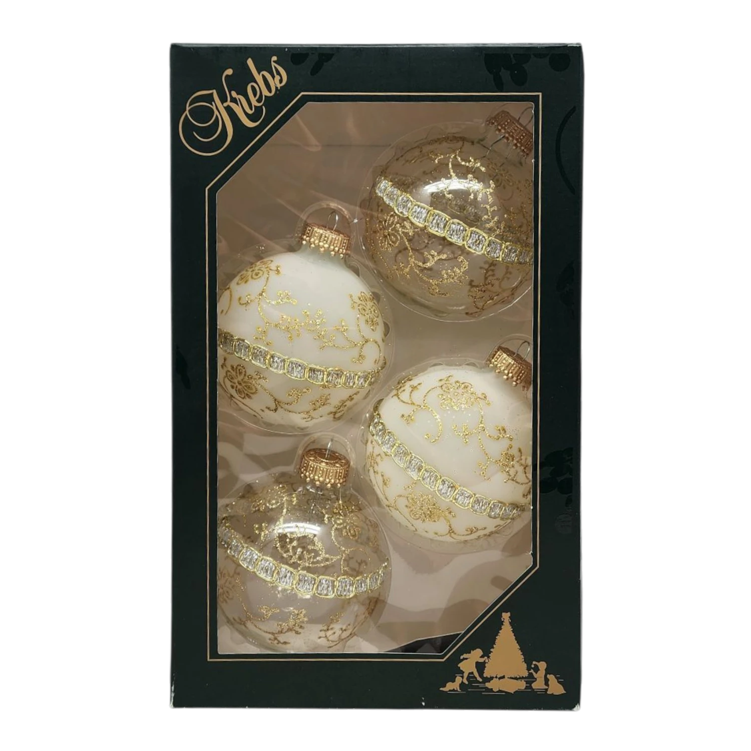 Elevate your holiday décor with our exquisite set of four glass ball ornaments, featuring a luxurious “Gilded Elegance” design that perfectly captures the spirit of the season! Each ornament, measuring just over 2.5 inches in diameter, showcases a beautiful combination of creamy white and shimmering gold accents. The intricate gold floral patterns elegantly swirl around the ornament, beautifully complemented by a sparkling band of gem-like embellishments, creating a look of refined sophistication.
