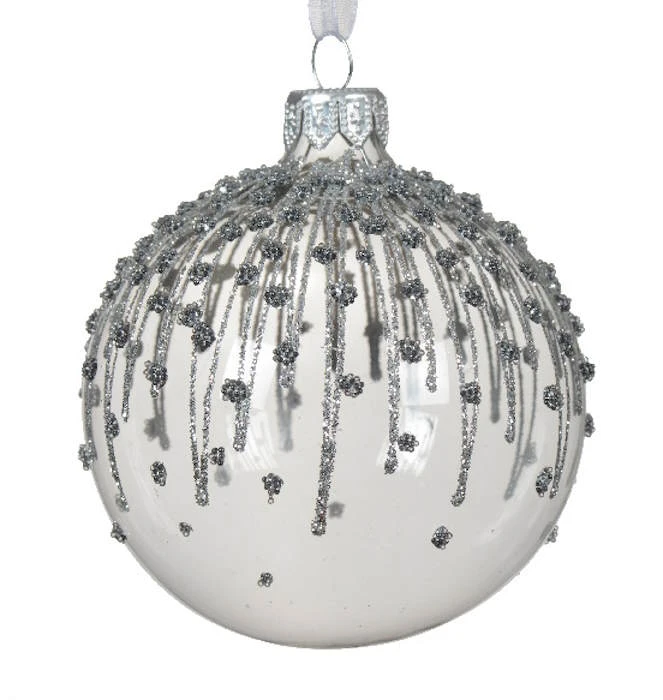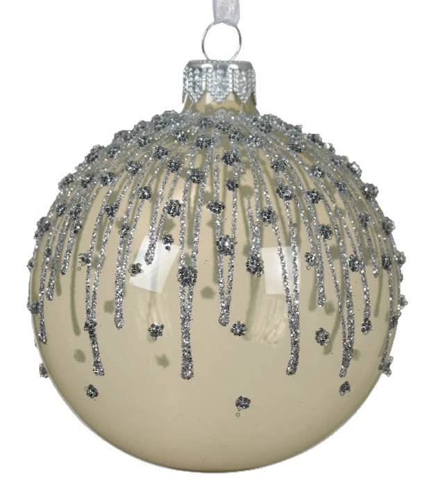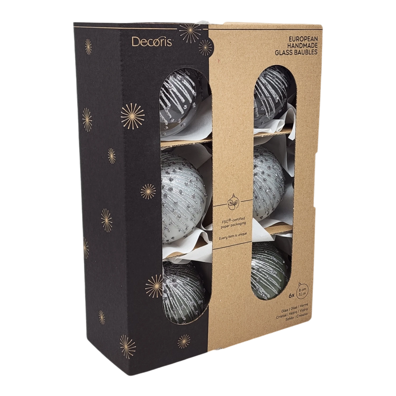 Add a touch of elegance to your holiday decor with the stunning Decoris Glass Baubles set, featuring exquisite European craftsmanship from Ukraine. This lovely collection includes six beautiful ornaments, each measuring approximately 3.1 inches in diameter. With a palette of shimmering whites and soft metallics, these baubles are adorned with delicate silver glitter designs that evoke the beauty of winter.