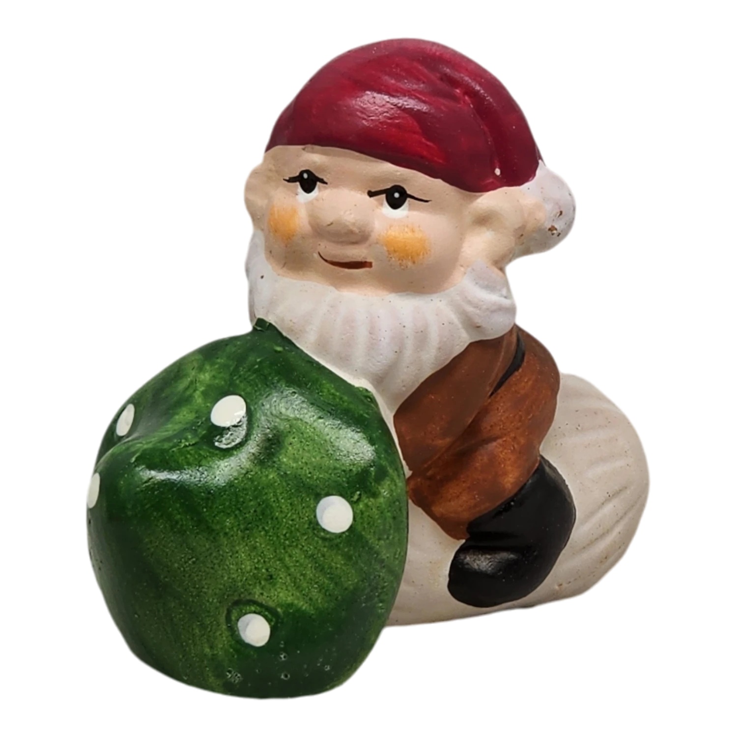 This charming garden gnome ornament, perched jauntily on a whimsical green mushroom, is sure to infuse a sense of magic and cheer into any setting. With his rosy cheeks, bright smile, and classic red cap, this delightful figure is a quintessential representation of gnomes, who have long been considered guardians of the garden. The intricate details, from the gnome’s bushy white beard to the mushroom’s detailed spots, highlight the care and craftsmanship that goes into creating such enchanting pieces.
