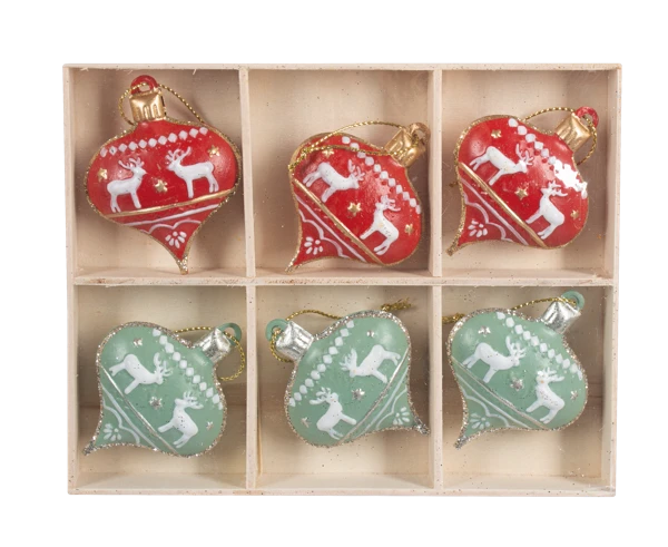 Includes 6 metal bauble shaped ornaments that “jingle”