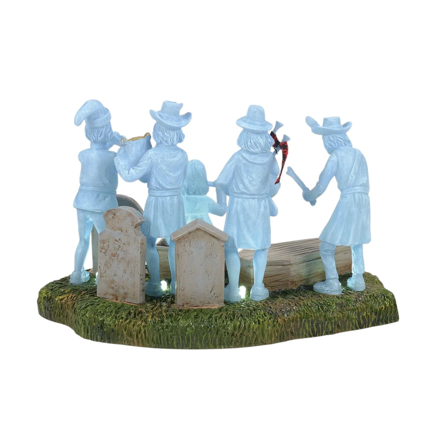 Bring a spine-chilling musical atmosphere to your Halloween Village with “The Phantom Five,” a captivating accessory standing at 3.75 inches tall! This eerie yet charming quintet consists of ghostly figures, each holding an instrument as they serenade the dearly departed in classic spectral style. With their ethereal glow, these musicians evoke a sense of playful spookiness, perfect for setting the mood for your haunted celebrations.