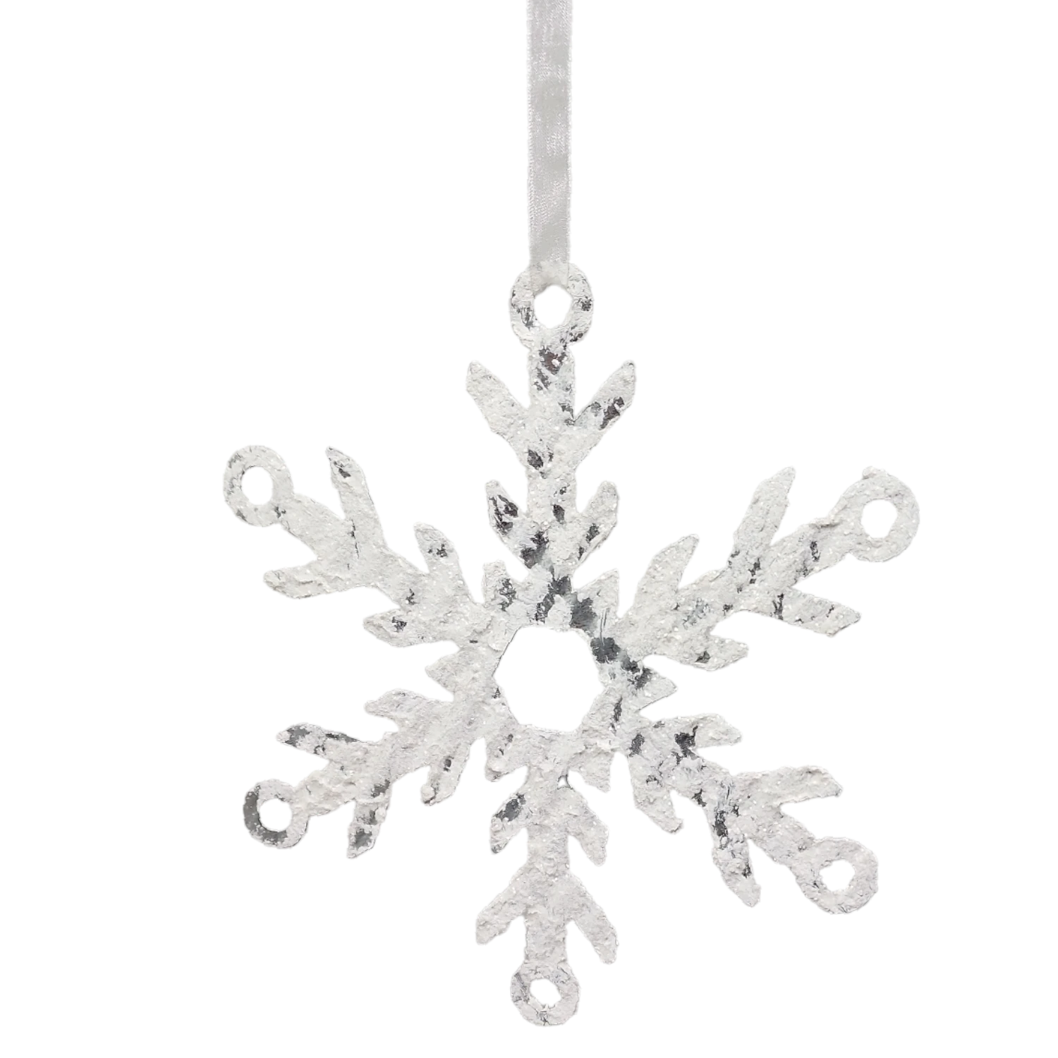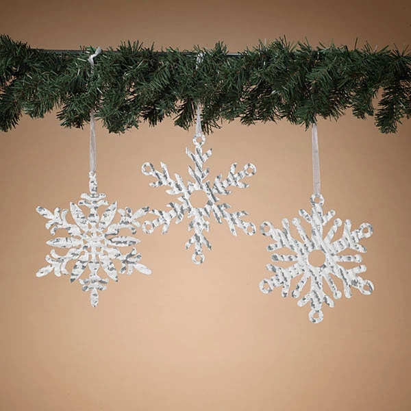 Diecut galvanized metal Snowflakes coated on both sides with a white ‘snow’ flocking.