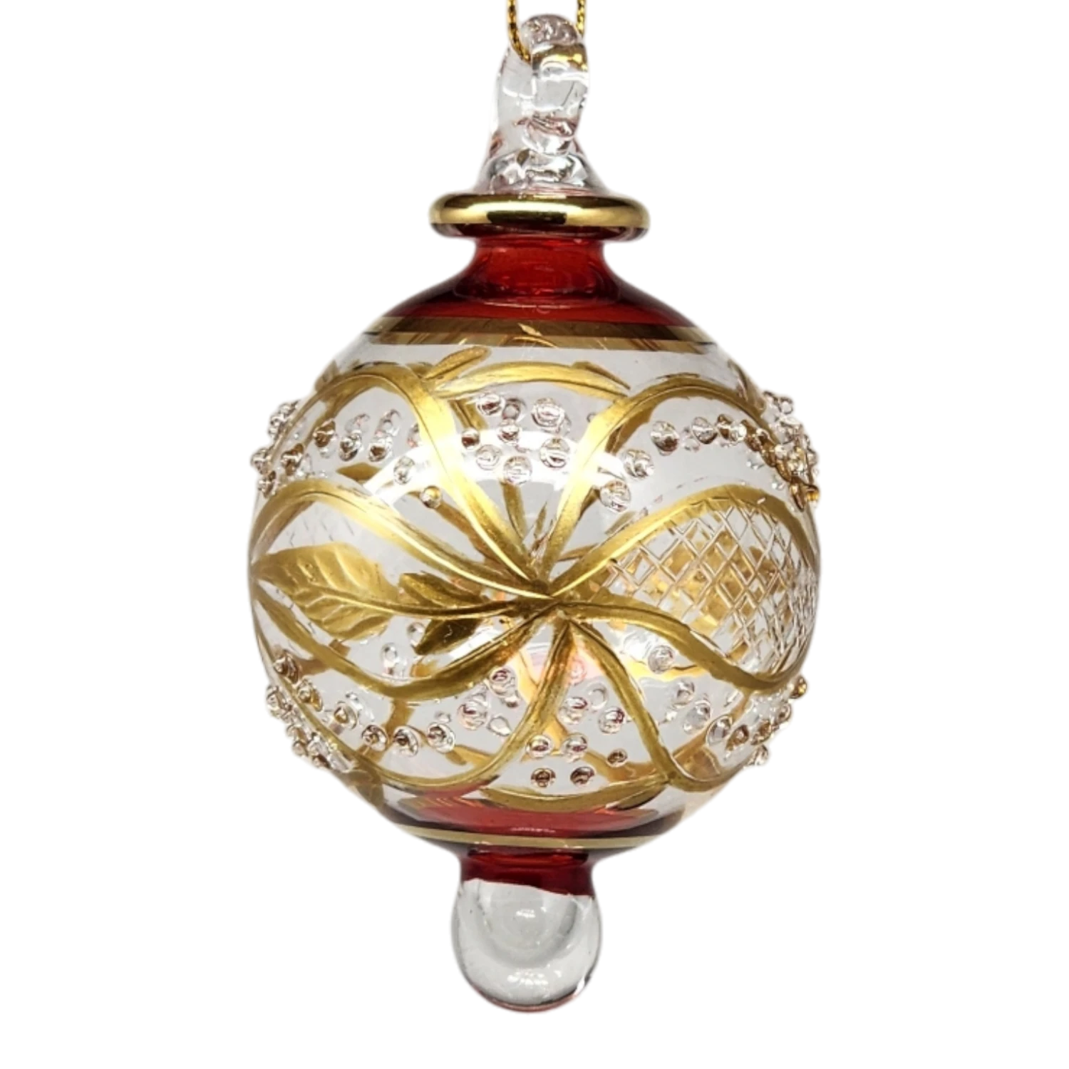 Unveil an opulent addition to your holiday decor with our Floral Etched Stipple Ball in Red. This exquisite ornament showcases the artistry and precision of traditional glassblowing techniques. Handcrafted from Pyrex, it gleams with intricate etchings, and the elegant embellishment of 10k genuine gold plating ensures its timeless allure. Just over 4 inches long and almost 2.5 inches in diameter, this ornament guarantees a striking presence on any tree or display.
