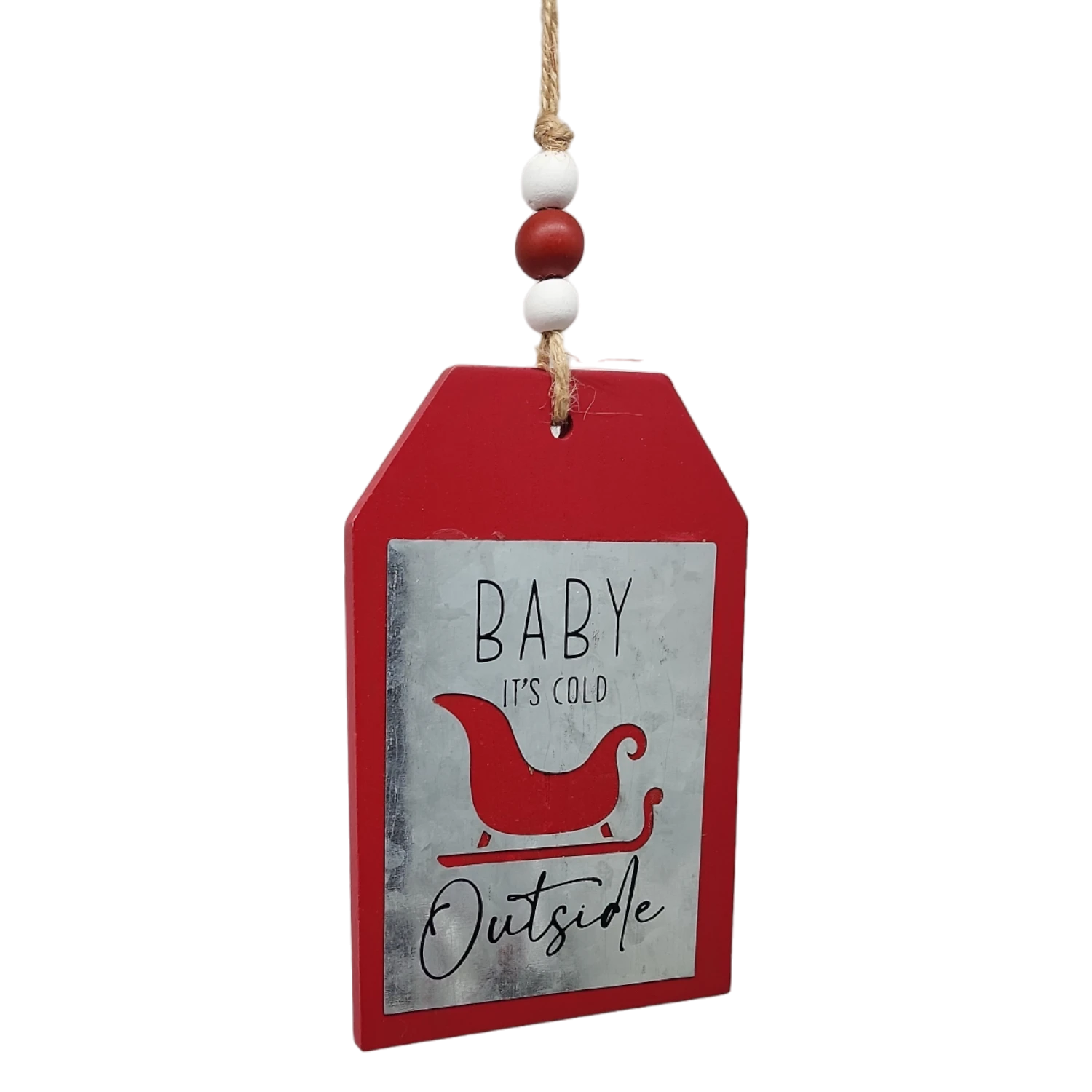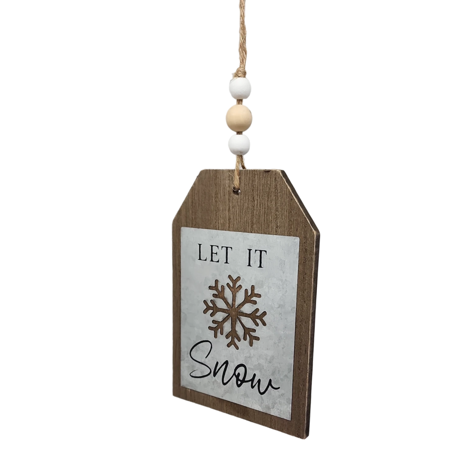 This beautiful holiday tag sign is made of wood with a layer of cutout galvanized tin.