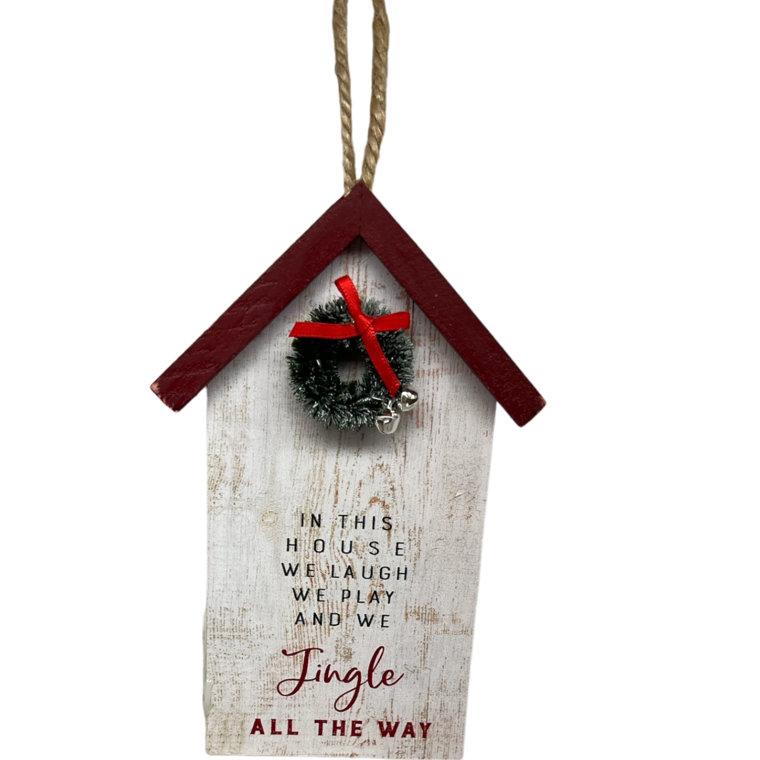 The house is painted in a distressed white finish, giving it a cozy, vintage appeal. The roof is accented with a deep red trim, complementing the festive look. At the center of the house, a small wreath decorated with a vibrant red ribbon and tiny jingle bells brings a festive touch. The heartfelt inscription reads, “In this house we laugh, we play, and we jingle all the way,” beautifully scripted in a combination of black and red.