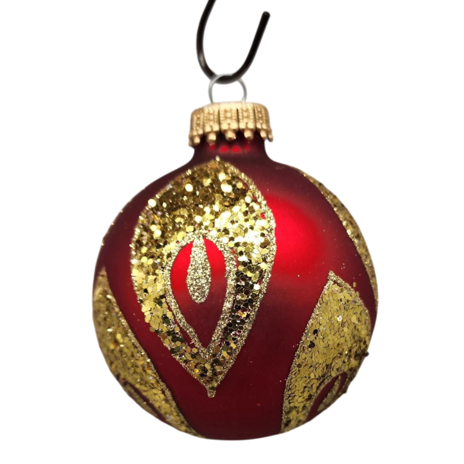 Sprinkle some glamour into your holiday decorating with our stunning set of four red glass ball ornaments, highlighted by elegant gold glitter designs! Each ornament features a rich red finish, beautifully adorned with intricate gold patterns that radiate luxury and festive cheer. Measuring just over 2.5 inches in diameter, these eye-catching ornaments are perfect for embellishing your Christmas tree or adding charm to your seasonal displays.