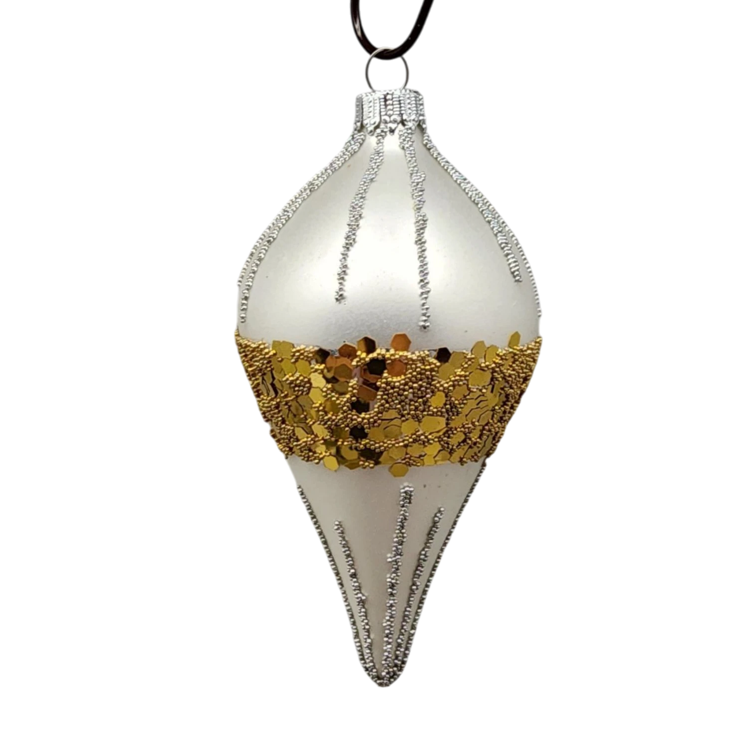 Add a touch of elegance to your holiday décor with our exquisite set of three white drop-shaped ornaments, beautifully adorned with shimmering metallic accents! Each ornament features a graceful design, showcasing a smooth white finish accented by sparkling silver and rich gold details that create a luxurious look. Measuring just over 4 inches in length, these ornaments are perfect for adding a sophisticated flair to your Christmas tree or festive displays.