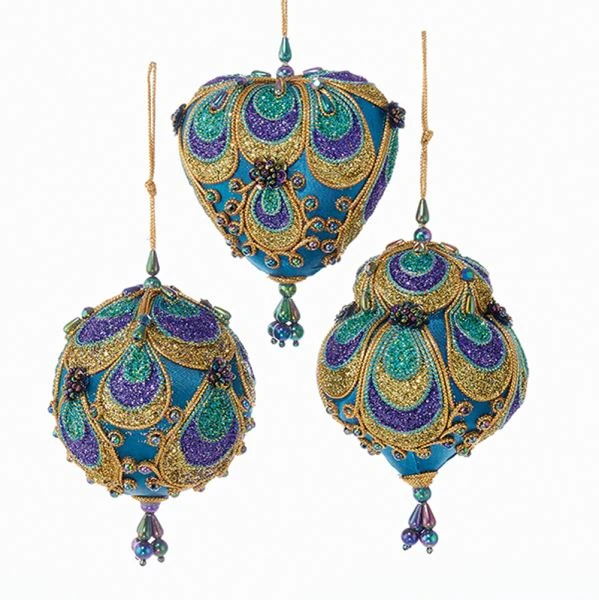 From Kurt Adler, These Aqua Satin Fabric with Gold, Purple and Green Glitters Tornasol Beads with Rayon Cord Hanging Ornaments will Brighten any tree.