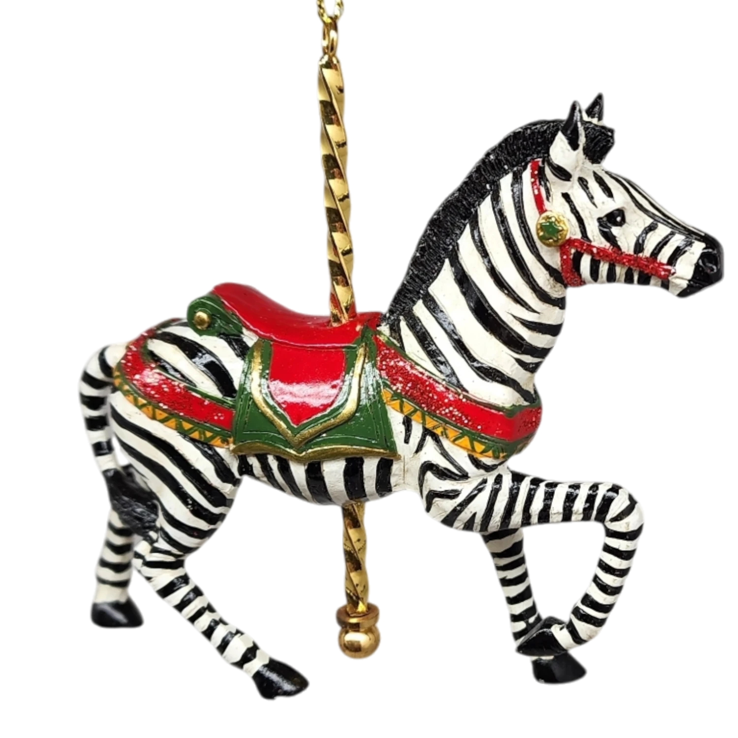 Handpainted Polyresin Ornament Depicts a lavish Carousel Animal, complete with Gold Twist Pole and Saddle.