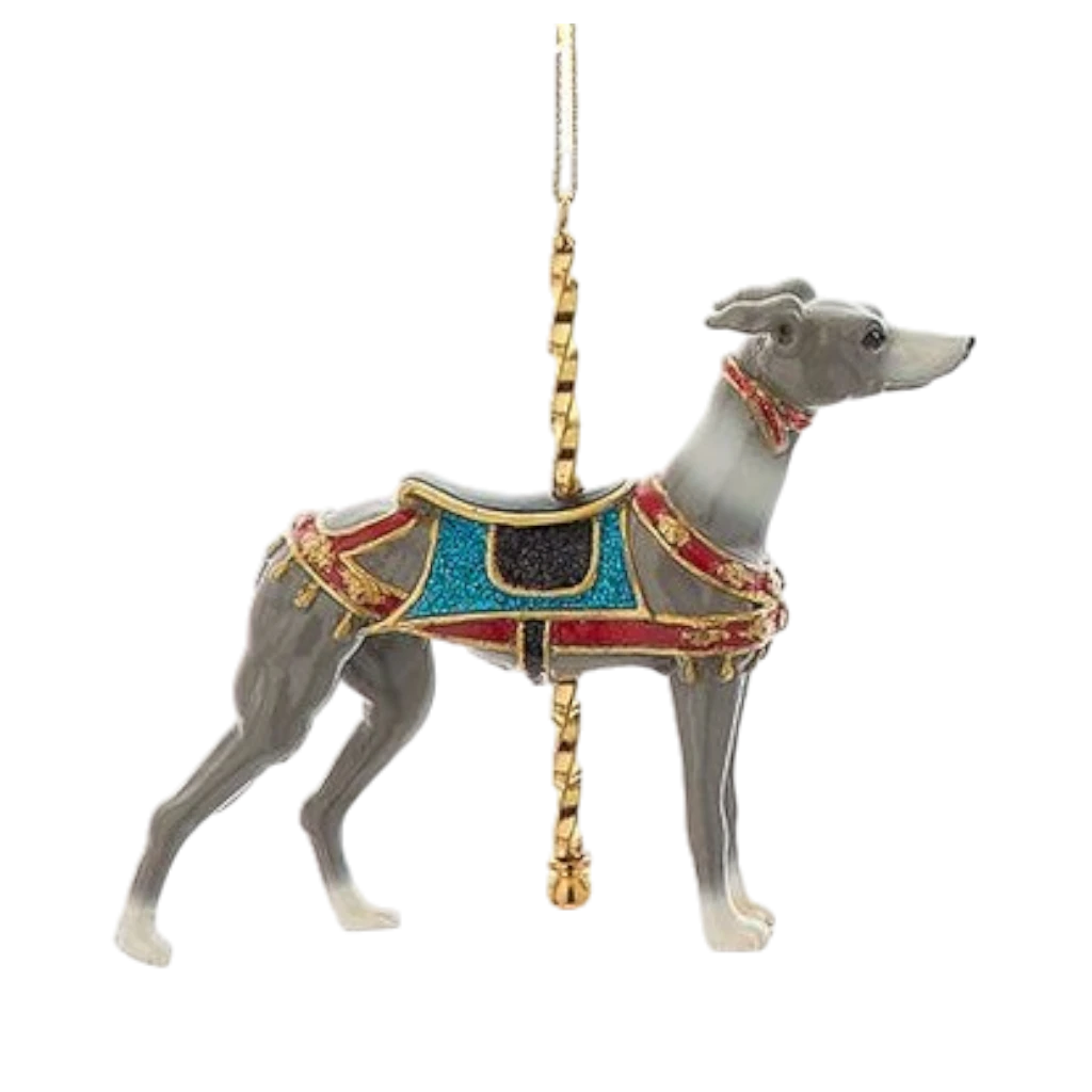 Handpainted Polyresin Ornament Depicts a lavish Carousel Animal, complete with Gold Twist Pole and Saddle.