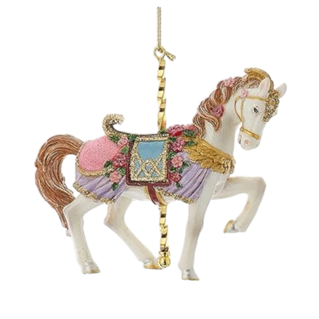 Handpainted Polyresin Ornament Depicts a lavish Carousel Animal, complete with Gold Twist Pole and Saddle.