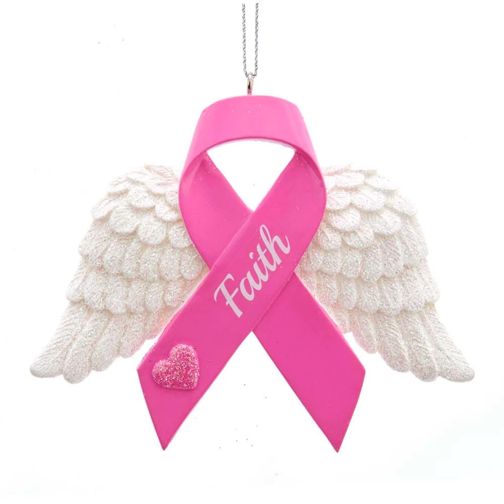 This Susan G. Komen® ornament from Kurt Adler is a wonderful addition to your holiday décor or Christmas tree. It features a classic pink ribbon with the word ” Faith” inscribed on it and a glittered pink heart with white glittered angel wings
