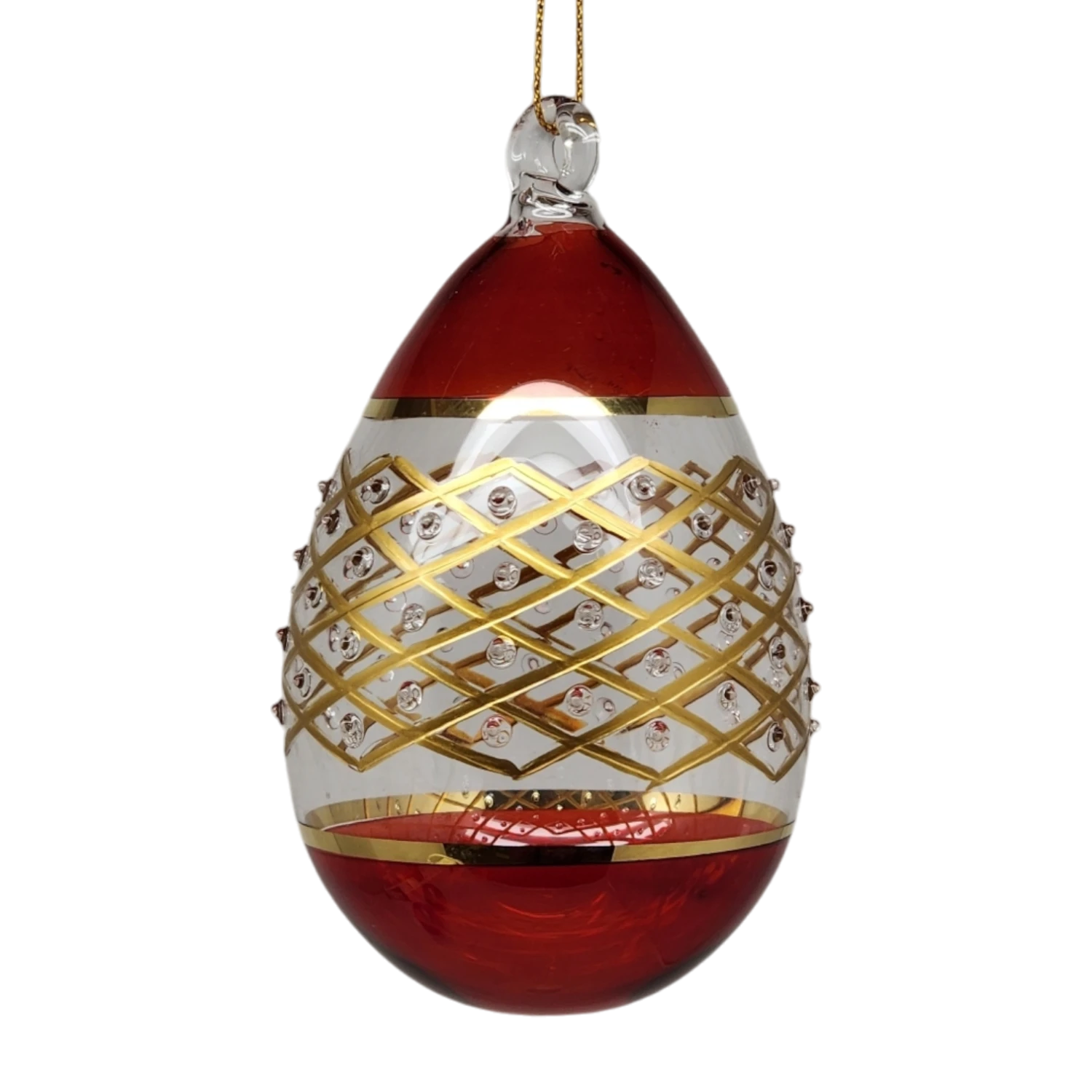 Introducing the Lattice Banded Stipple Glass Egg in Red, a masterpiece of festive craftsmanship that will add unparalleled elegance to your holiday decor. This stunning ornament is handcrafted from high-quality Pyrex, showcasing a rich red hue interwoven with a delicate lattice pattern in 10k genuine gold plating. The stipple details add a delightful texture, making this almost 4 1/2-inch egg ornament a captivating focal point.