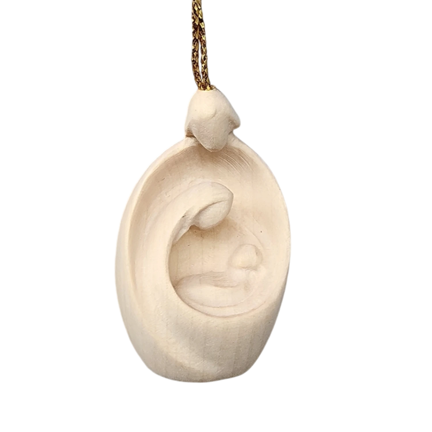 Presenting our exquisitely crafted “Holy Family” nativity ornament, hand-carved from beautiful Maple wood in Italy. Standing at a delicate 2 inches tall, this stunning piece captures the serene and loving depiction of Mary, Joseph, and Baby Jesus, all intricately detailed within an elegant, oval-shaped frame.