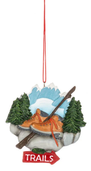 For the adventurers at heart, this trails-themed ornament is the perfect addition to your holiday decor, standing just over 3 inches tall and expertly crafted from durable polyresin. Featuring a pair of detailed hiking boots, a sturdy walking stick, and a vivid “Trails” sign, this ornament captures the essence of the great outdoors. Nestled among evergreen trees with a backdrop of majestic mountains, it evokes the spirit of exploration and the beauty of nature.