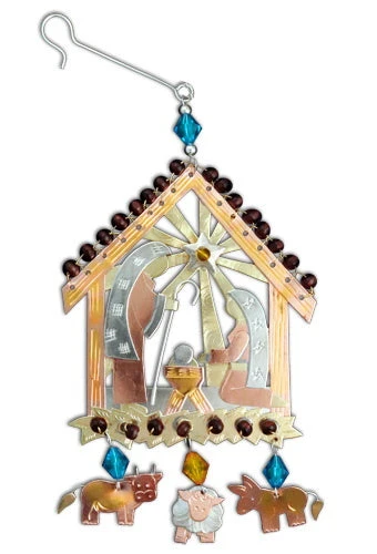 Amazing Handmade metal ornament in the shape of a Creche with the Holy Family complete with the animals hanging below