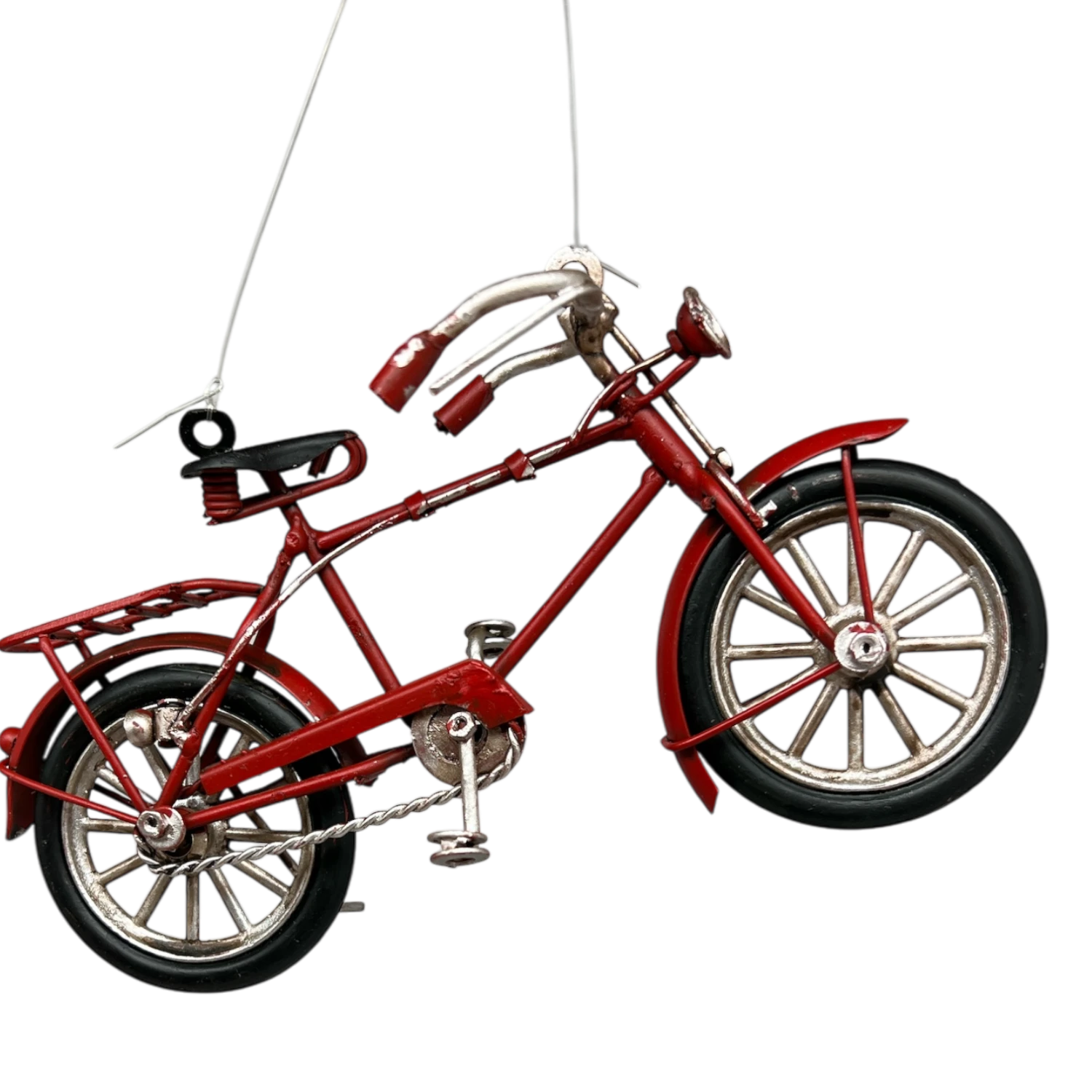 Rev up your holiday spirit with our charming red metal bicycle ornament! Measuring just over 6 and a half inches in length and just over 3 inches wide, this vibrant piece is a delightful addition to your Christmas tree or a fun accent for any festive décor. Its classic design brings to mind carefree rides down tree-lined streets and sunlit adventures, making it a wonderful reminder of the joy of exploration that comes with every pedal stroke.