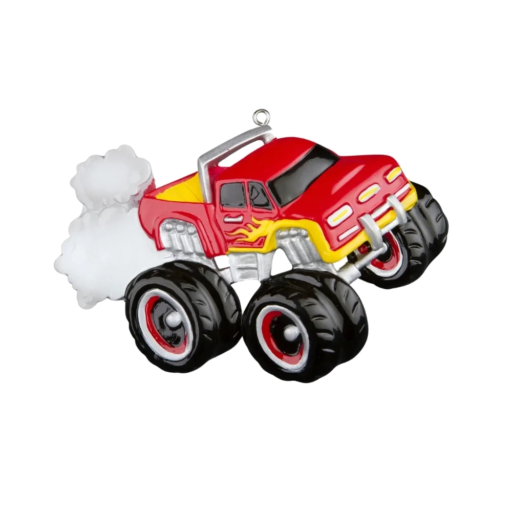 Rev up the excitement of the holiday season with this thrilling monster truck ornament. Featuring a vibrant red and yellow design with fiery decals, this ornament captures the power and fun of monster trucks in action. With its oversized wheels and dynamic details, this eye-catching piece is sure to bring a sense of adventure and high energy to your Christmas tree.