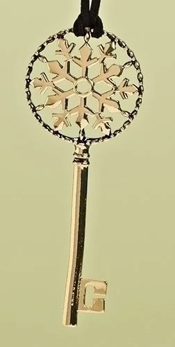 This ornament features a snowflake patterned golden key, the key Santa Claus uses to open all the doors in the world. It is 4 inches long, and comes in a clear plastic box, with a faux suede cord for hanging the ornament on the tree. It also comes with a little card and a verse.
