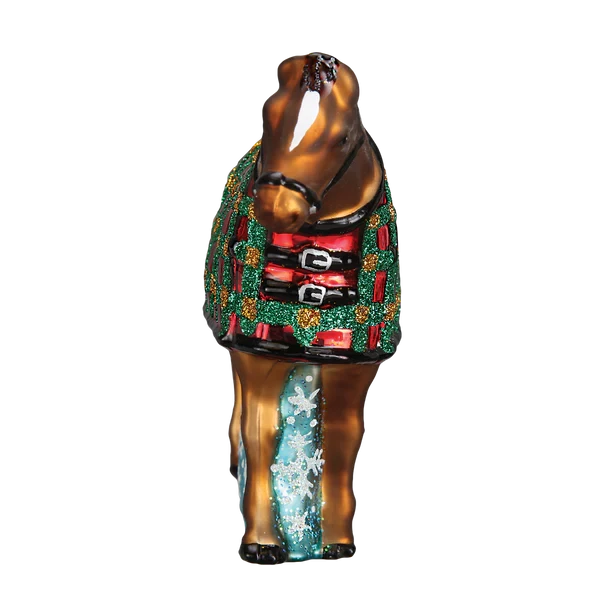 Celebrate the beauty of winter and the majesty of horses with our delightful Snowflake Horse Glass Ornament! Measuring approximately 3.5 inches tall, 4.5 inches wide, and 1.5 inches deep, this stunning ornament captures the charm of a beautifully adorned horse draped in a vibrant, festive blanket featuring a striking pattern of red and green.