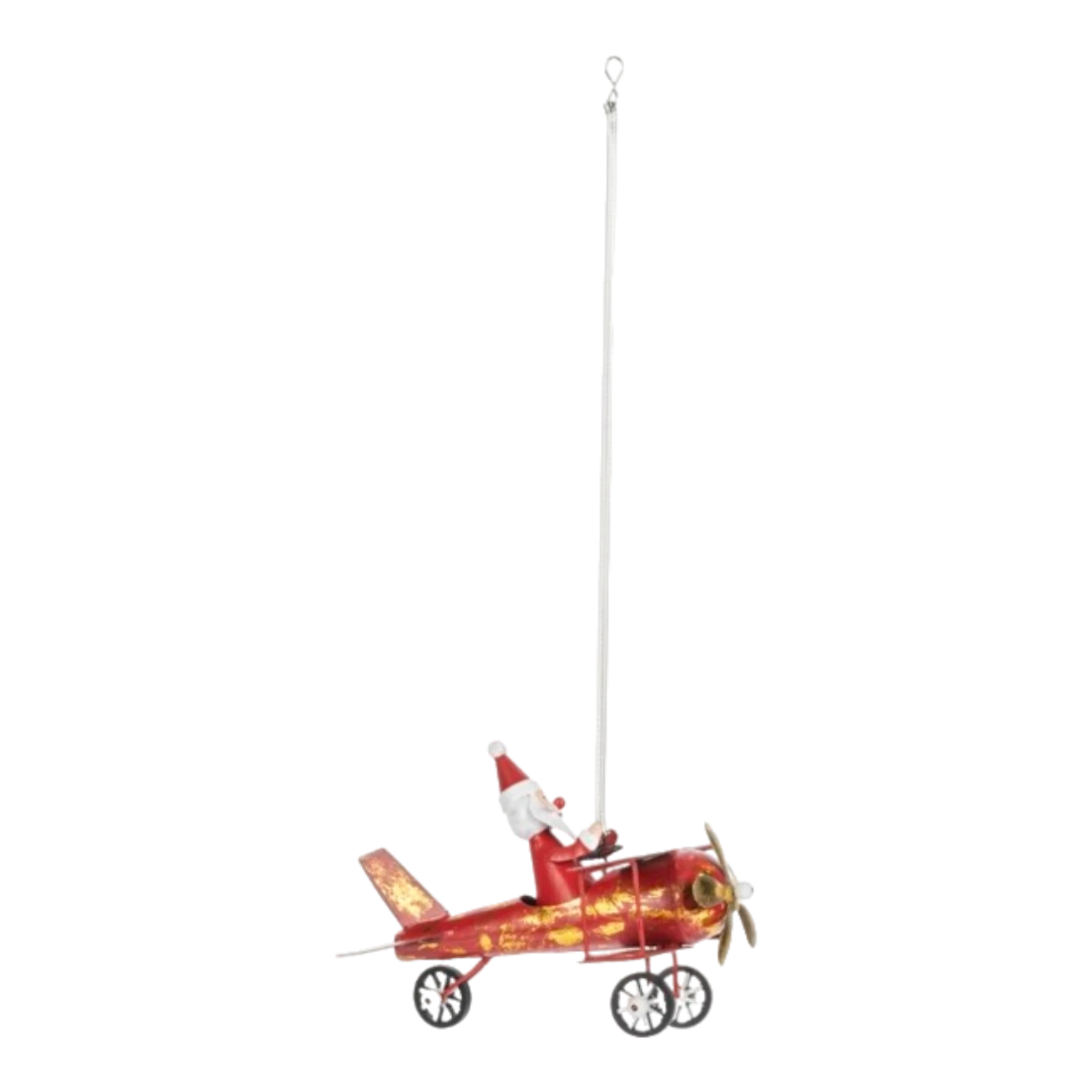 Vintage-styled ornament has a very festive Pilot in a Metal biplane decorated for the holidays.