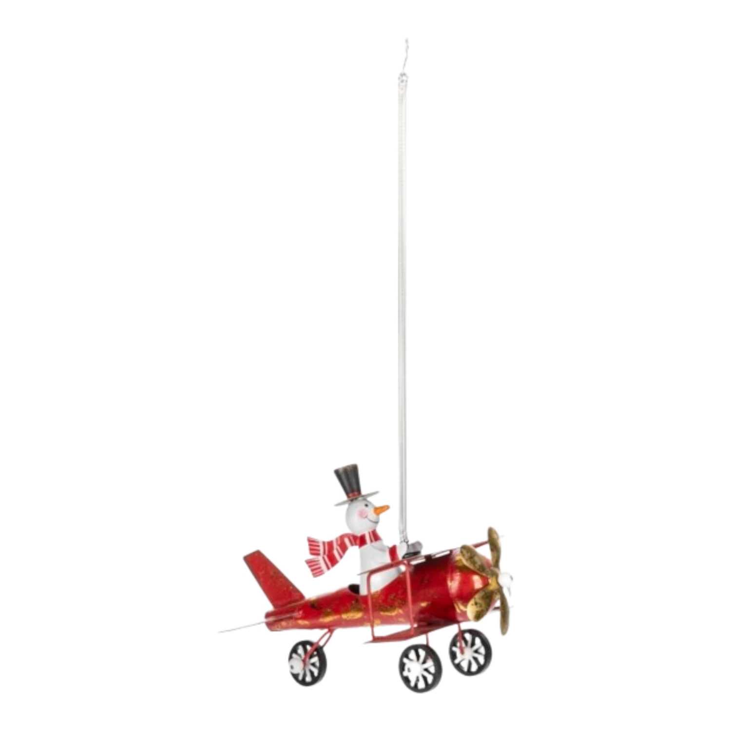 Vintage-styled ornament has a very festive Pilot in a Metal biplane decorated for the holidays.