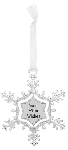 Intricate snowflake with a swirl design. The sentiment is printed on the center of the flake.
