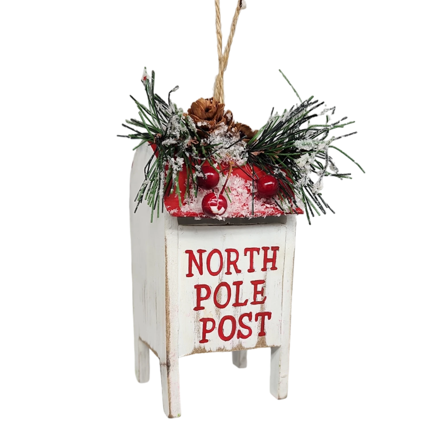 Adorable wooden mailbox accented with Pine and Berries.