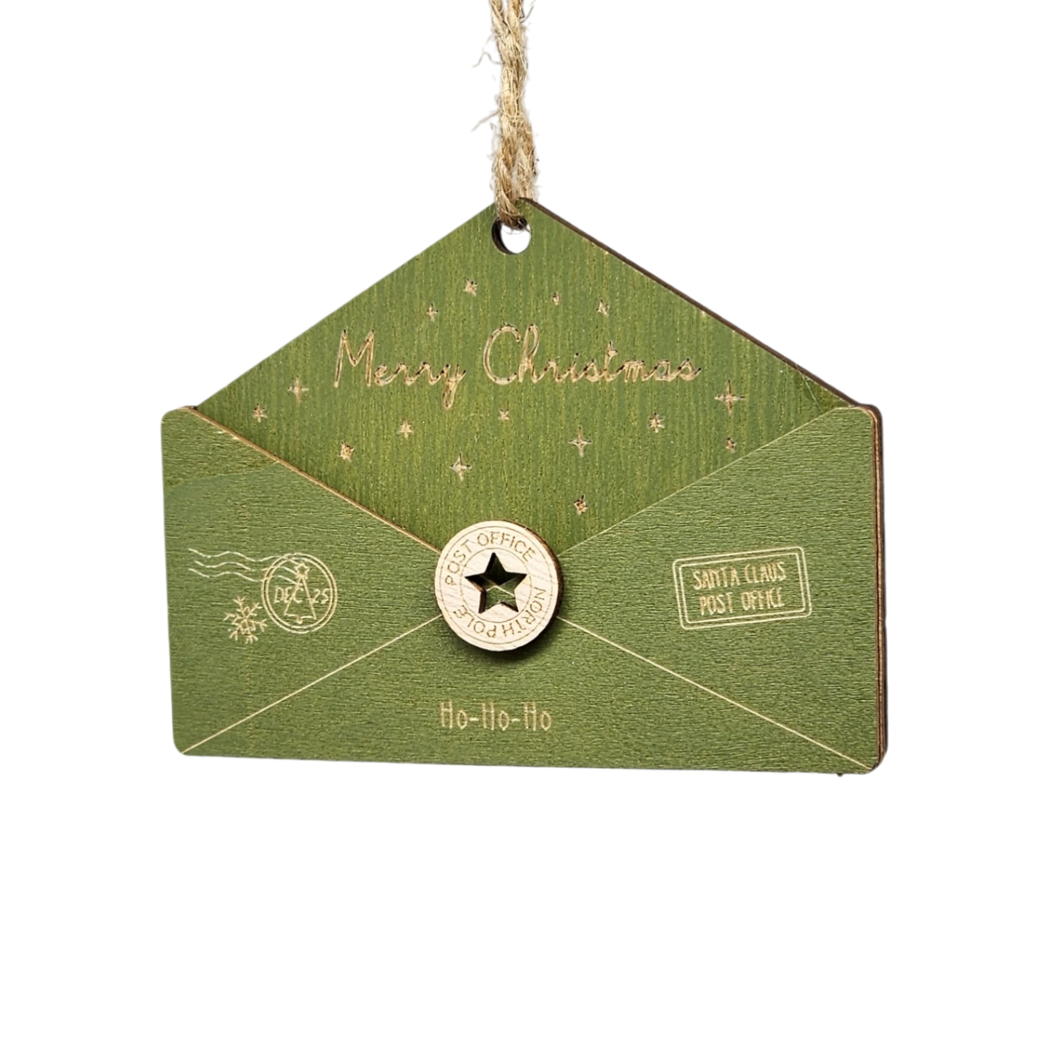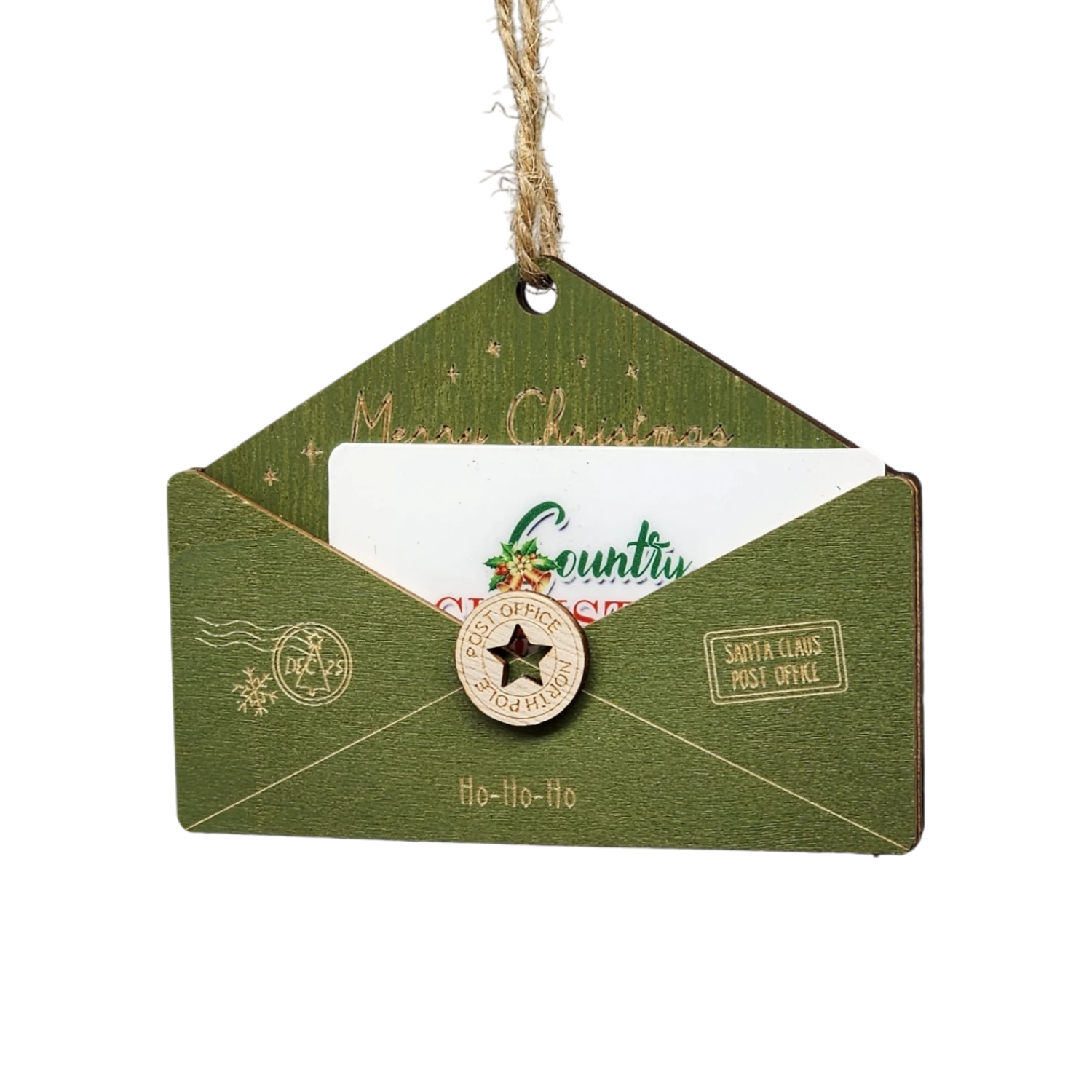 Bring a little extra magic to your holiday celebrations with this charming wood ornament gift card holder. Shaped like an envelope and adorned with festive details such as North Pole stamps and a jolly “Ho-ho-ho,” this holder captures the joyous spirit of Christmas. Its rustic green wood finish adds a warm, natural touch to your holiday décor.
